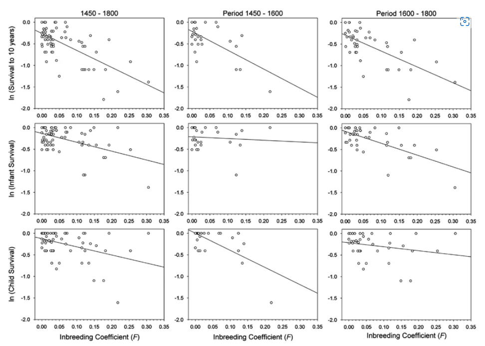 งานวิจัยด้านสาแหรกวิทยาโดย Ceballos และ Alvarez ในหัวข้อ “พระราชวงศ์ในฐานะของห้องปฏิบัติการผสมพันธุ์มนุษย์: พวกฮับสบูร์ก” (Royal dynasties as human inbreeding laboratories: the Habsburgs) ที่ตีพิมพ์ในวารสาร Heredity ในปี ค.ศ. 2013 ชี้ให้เห็นว่าการสมรสในหมู่เครือญาติตลอดหลายชั่วคนของราชวงศ์ฮับส์บูร์กนั้นมีความสัมพันธ์อย่างมีนัยยะสำคัญกับอายุขัยที่สั้นลงของสมาชิกราชวงศ์ ถึงแม้การสมรสในหมู่เครือญาติของพวกชนชั้นสูงจะถูกใช้เป็นเครื่องมือรักษาอำนาจทางการเมืองและความมั่งคั่งให้อยู่ในมือของคนในครอบครอบเดียวกัน แต่ก็ส่งผลให้สมาชิกของครอบครัวเต็มไปด้วยคนที่มีสุขภาพอ่อนแอ เป็นหมัน หรือมีอายุขัยที่สั้นกว่าบุคคลทั่วไปที่ไม่ได้เกิดมาในครอบครัวที่มีการสมรสในหมู่เครือญาติ (ภาพที่ 2)